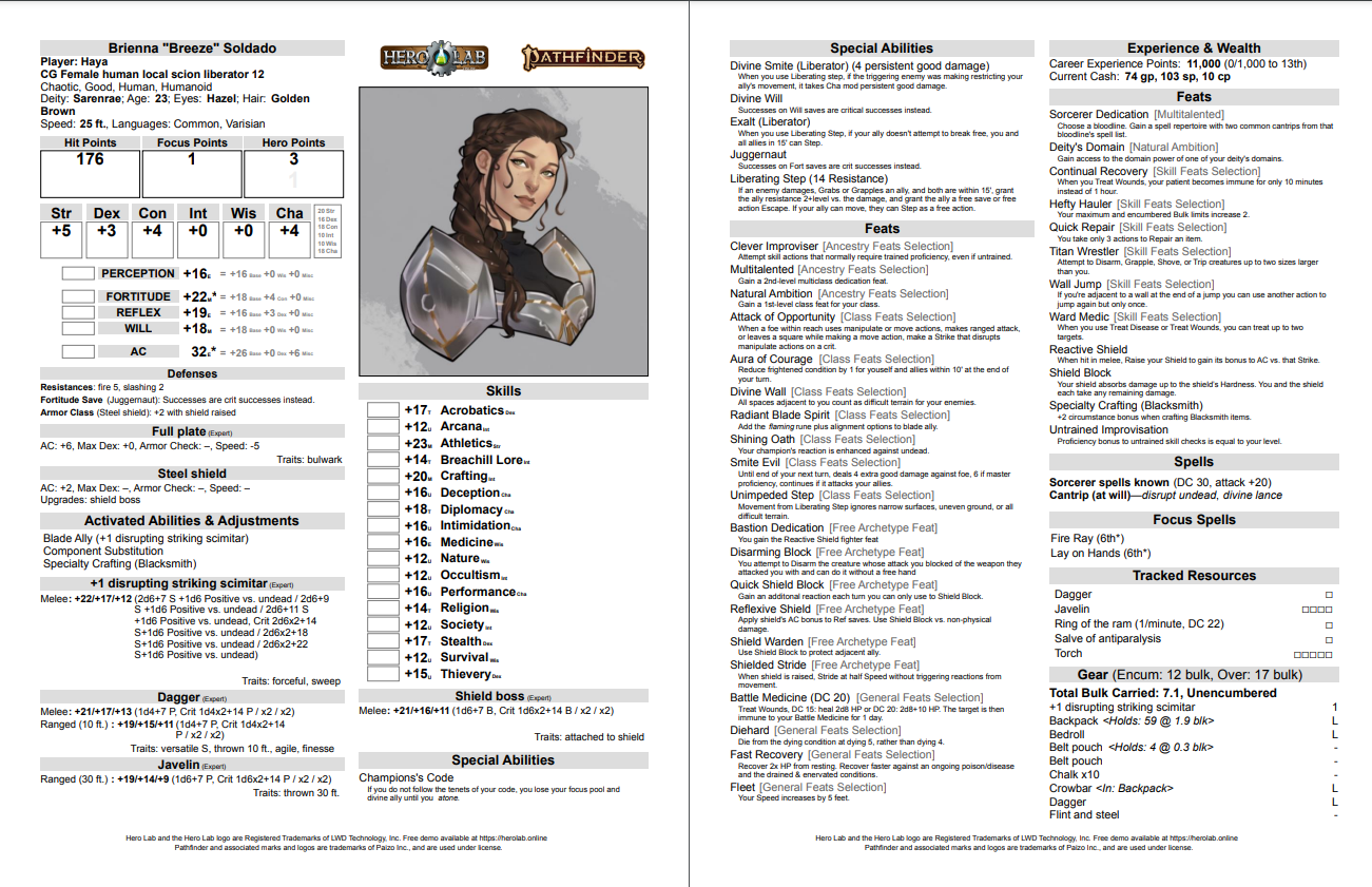 Brienna “Breeze” Soldado is a human Champion of Sarenrae and grew up in Korvosa with a family that comprised of her two older brothers, her fierce mother, and her doting uncle who visited as often as he could. After a mysterious illness swept the city and the young Brienna had a close brush with death, Korvosa started to become more dangerous, so the Soldados decided to flee to Breachill. Young Brienna had to say goodbye to her young best friend, (then Utsi, now Twin-Talon) perhaps for good. Fate, it seems, had different plans.