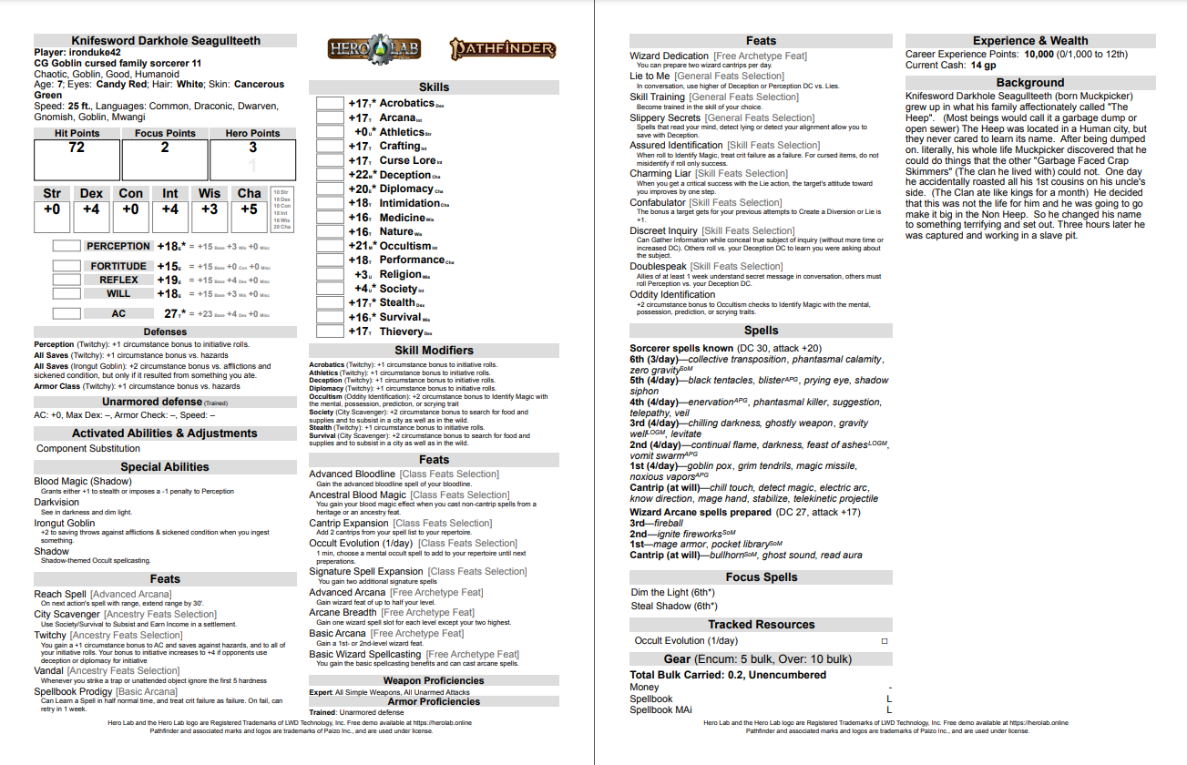 Knifesword Darkhole Seagullteeth (born Muckpicker) grew up in what his family affectionately called "The Heep". (Most beings would call it a garbage dump or open sewer) The Heep was located in a Human city, but they never cared to learn its name. After being dumped on. literally, his whole life Muckpicker discovered that he could do things that the other "Garbage Faced Crap Skimmers" (The clan he lived with) could not. One day he accidentally roasted all his 1st cousins on his uncle's side. (The Clan ate like kings for a month) He decided that this was not the life for him and he was going to go make it big in the Non Heep. So he changed his name to something terrifying and set out. Three hours later he was captured and working in a slave pit.